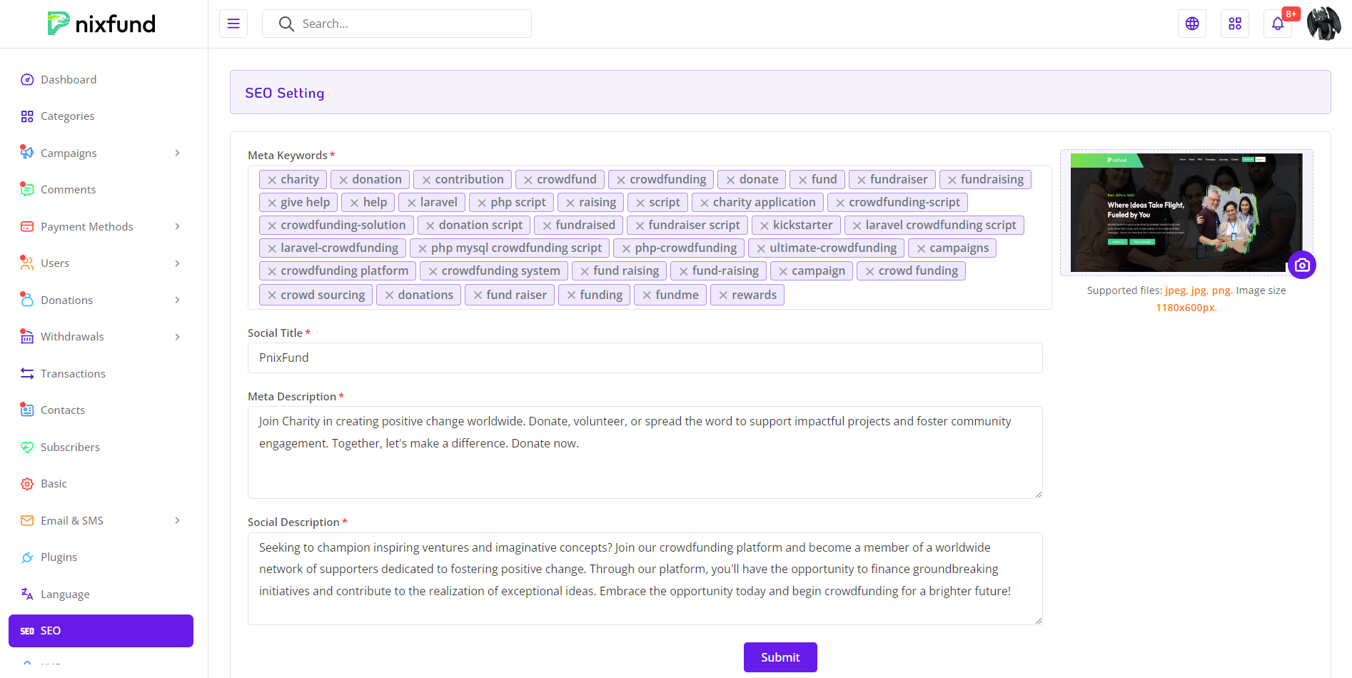 Admins can input relevant meta keywords to enhance the web application's visibility in search engine results.