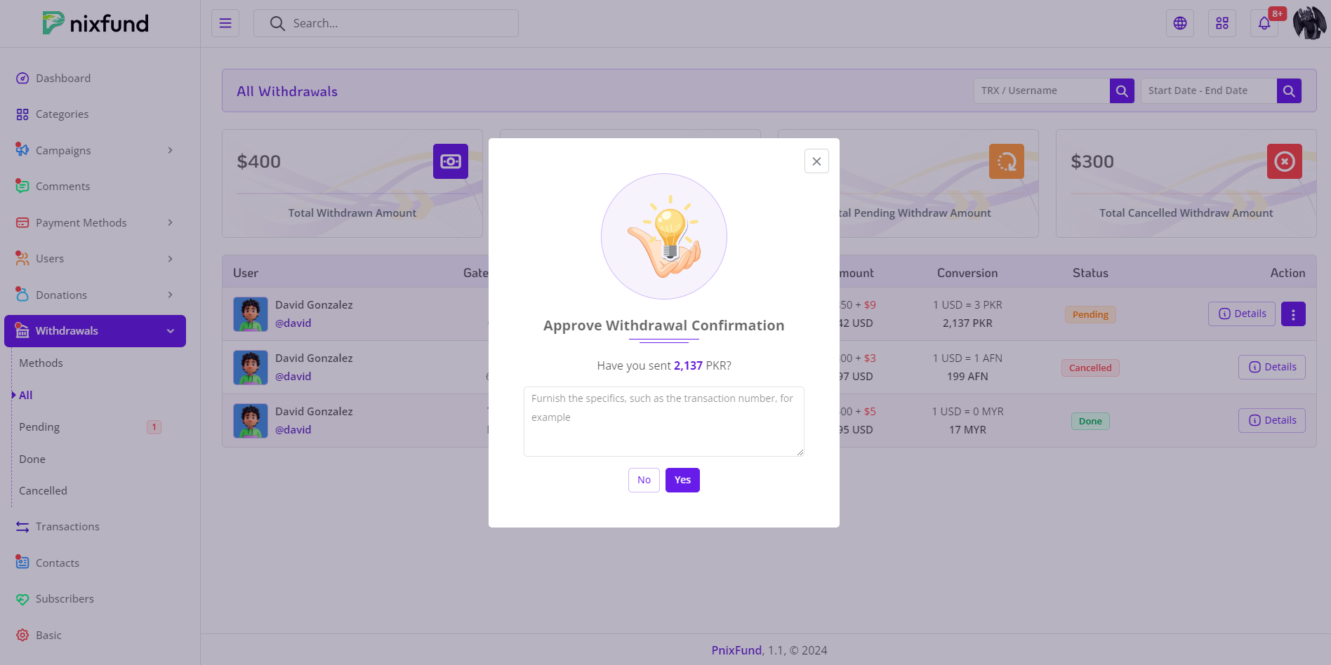 Facilitate a streamlined communication process by allowing administrators to ask transaction proof from users, ensuring a secure and accountable withdrawal process. -