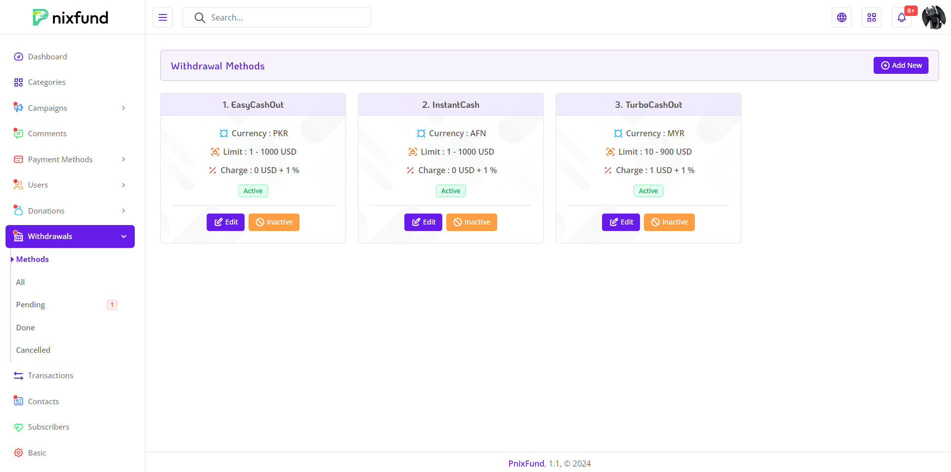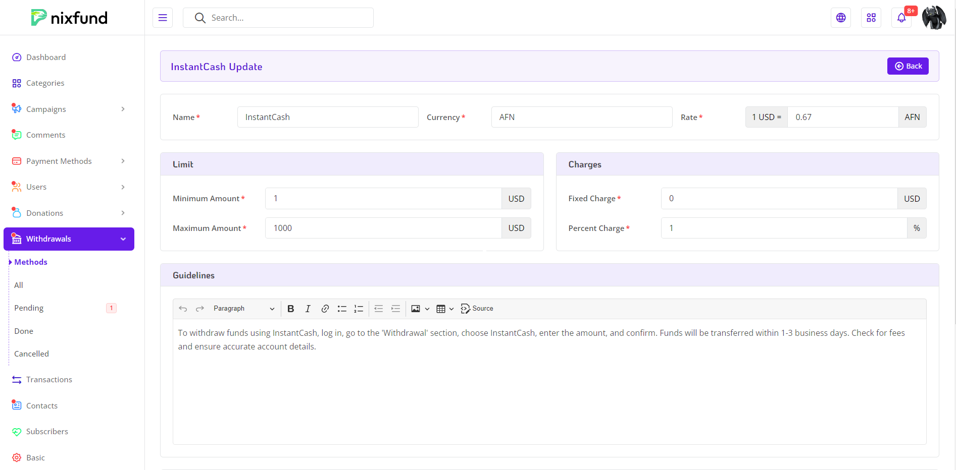 Discover the Withdrawals Method Management Section. Offering administrators detailed control over the manual withdrawal process. This feature-rich page is designed to streamline the management of withdrawal methods, providing clarity and flexibility for administrators.