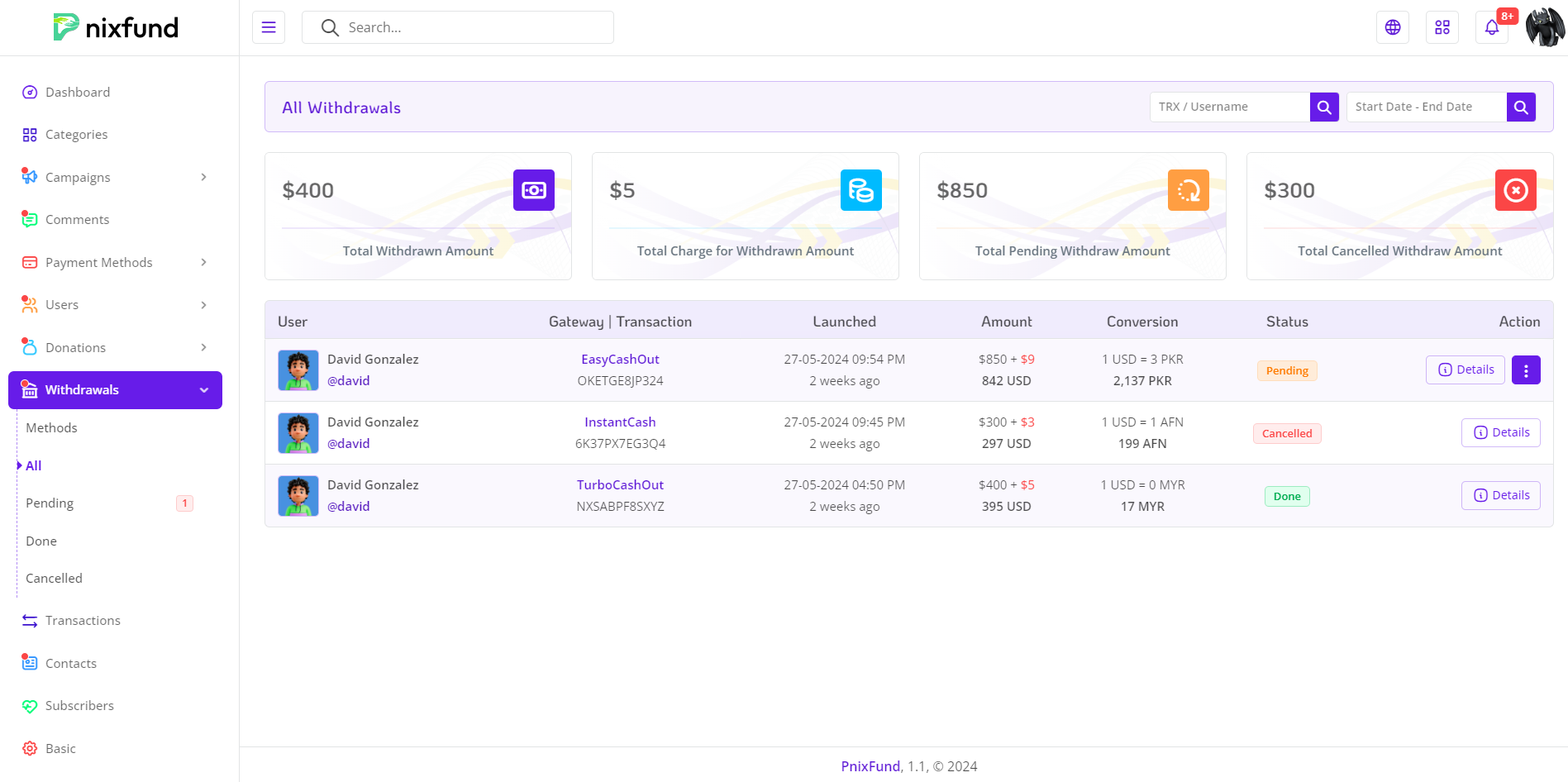 Explore the Withdrawals Management page within our Admin Panel, offering a comprehensive overview of financial transactions. This feature-rich page is designed to provide administrators with detailed insights into the status and details of user withdrawals.
